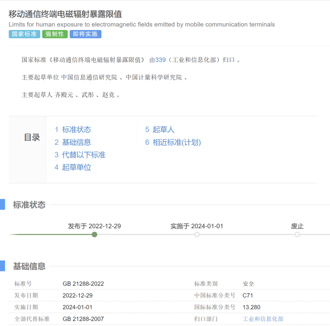 2022年12月29日,由中国信息通信研究院和中国计量科学研究院联合编制的强制性国家标准GB21288-2022《移动通信终端电磁辐射暴露限值》正式发布。该标准将于2024年1月1日正式实施。