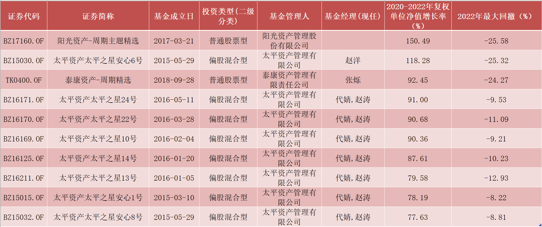 阳光资产-周期主题精选位居榜首,3年累计回报超150%;泰康资产-周期精选位列第3,3年累计回报92.45%。太平资产则是最大赢家,共有8只产品上榜,累计回报均超70%。