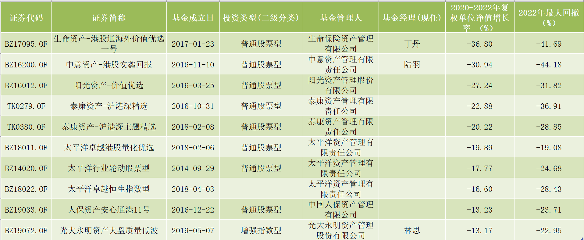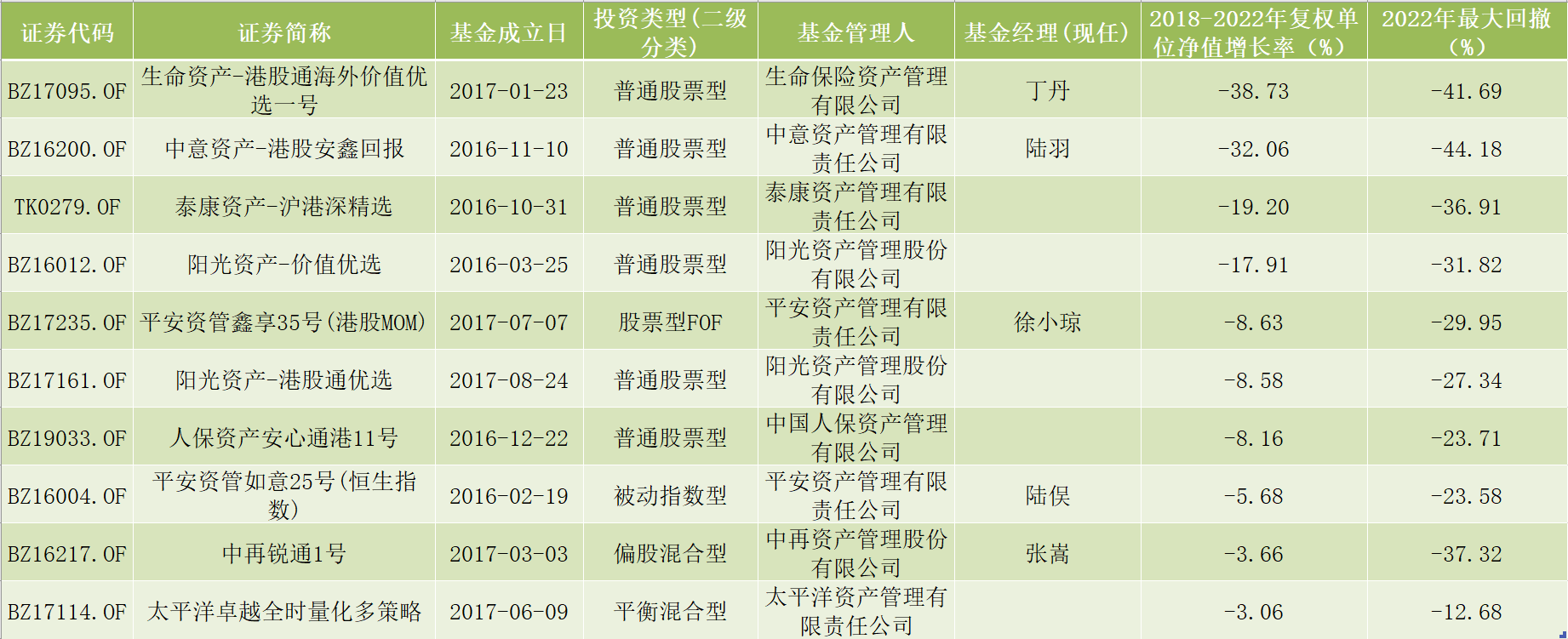 3年回报排名末十的权益类产品中,半数受累于这几年港股市场的惨淡。生命资产-港股通海外价值优选一号、中意资产-港股安鑫回报跌幅均超30%,泰康资产-沪港深精选、泰康资产-沪港深主题精选、太平洋卓越港股量化优选、太平洋卓越恒生指数型、人保资产安心通港11号等跌幅较大。