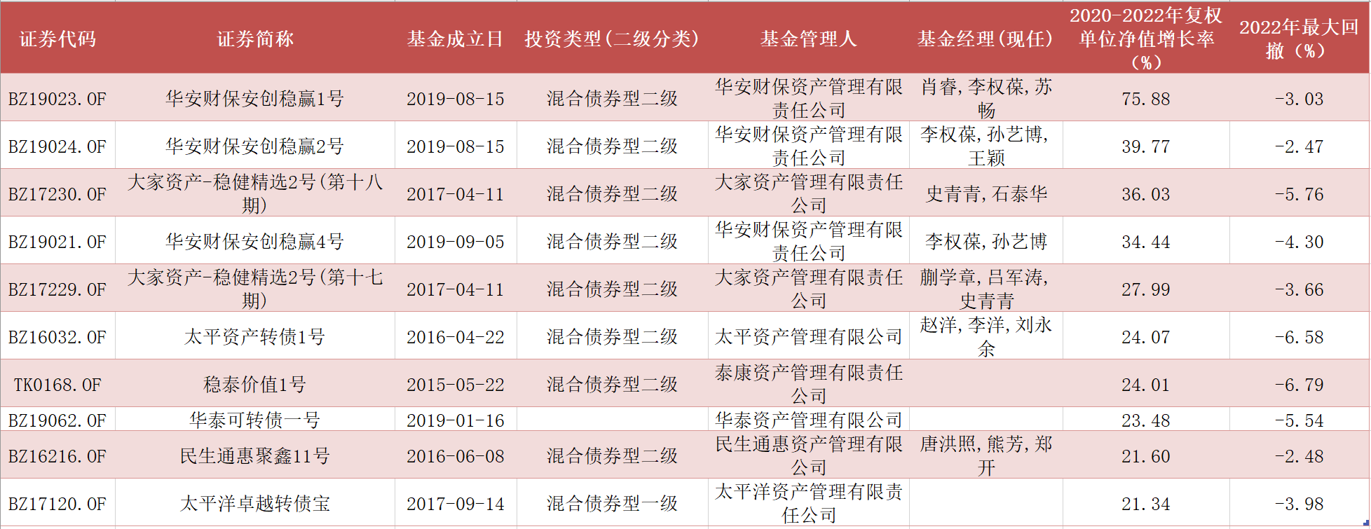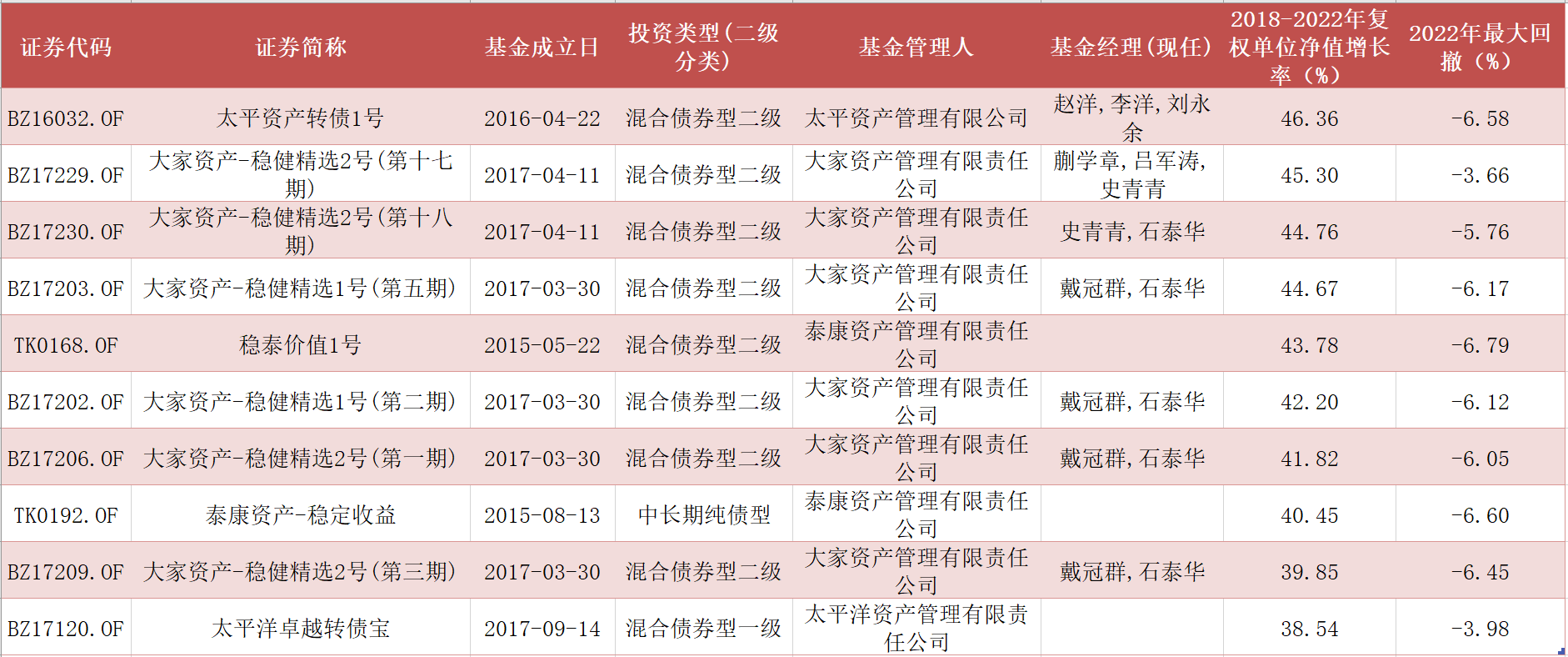 太平资产转债1号夺得榜首,累计回报46.36%。上市公司披露的2022年三季报显示,该产品为德龙激光(688170.SH)、红星发展(600367.SH)两家公司前十大流通股股东,分别持有36.66万股、99.92万股,持仓市值为1944.81万元、1777.58万元。
