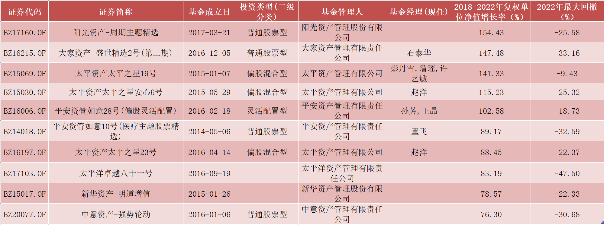 更长时间来看,2018-2022年的5年时间,有业绩数据的产品减少至282只,平均复权单位净值增长率为26.43%,整体呈现多家争鸣的局势。
