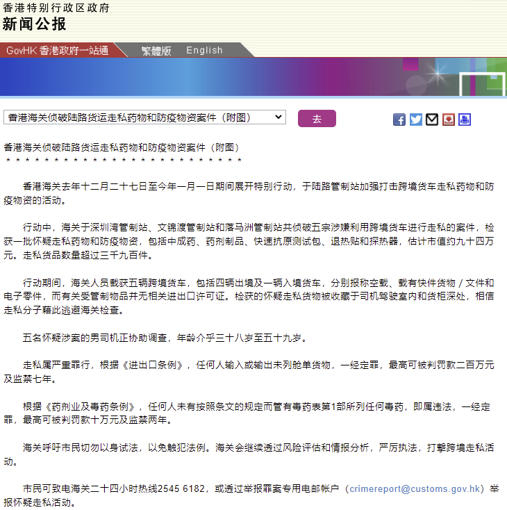 据香港特区政府网1月3日发布的新闻公报,香港海关2022年12月27日至2023年1月1日期间展开特别行动,于陆路管制站加强打击跨境货车走私药物和防疫物资的活动。
