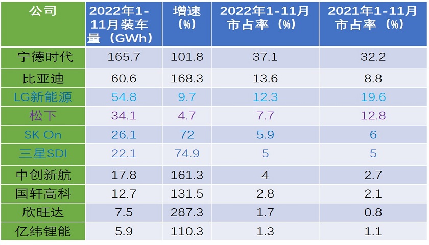 四家中资企业中创新航(03931.HK)、国轩高科(002074.SZ)、欣旺达(300207.SZ)和亿纬锂能(300014.SZ),依次位列去年前11个月装车总量的第七至第十名。