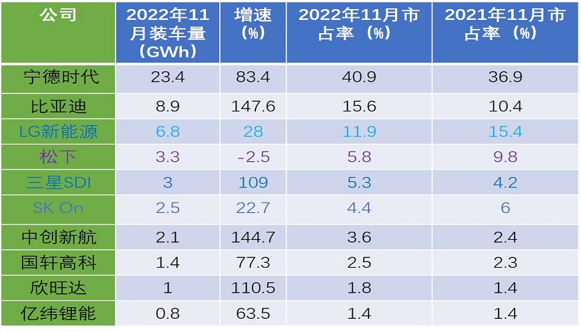 日本电池龙头松下是唯一出现单月负增长的企业,11月装车量为3.3 GWh,同比下降近3%。其去年1-11月装车总量排名全球第四,市占率为7.7%,同比下降逾5%,落后比亚迪接近6个百分点。