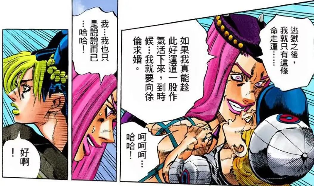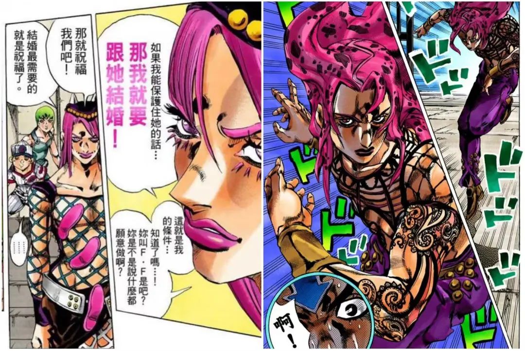 荒木不吝于表现空条徐伦的女性气质。而徐伦与安娜苏,是JOJO中首次对“恋爱”情愫展开刻画。JOJO向来不缺乏深情厚谊的情节,但却也正是因为由女性主导,爱的觉悟与爱的表达,才更加柔软。