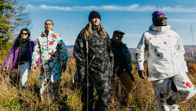 BURTON MINE 77滑雪系列的滑雪服有古典白、皇家紫、碎黄色与黑色四种颜色。滑雪服上有花卉刺绣图案,由艺术家Kitty Badhands设计。