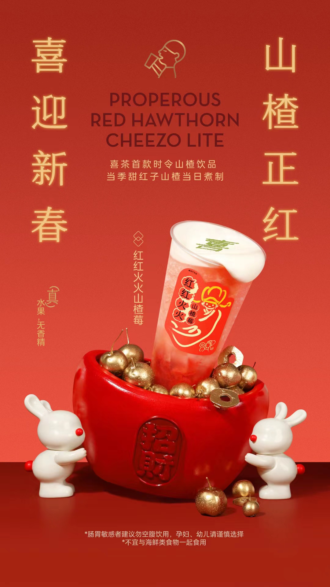 和瑞幸类似,喜茶的2023新品红红火火山楂莓,也配上了红色杯套,并赠送喜财神贴纸、门贴和徽章。除了精致的周边赠品外,奶盖上还有一个“喜”字。三顿半的礼盒也用鲜艳浓烈的红色,结合新年主题,紧紧抓住顾客们的眼球。