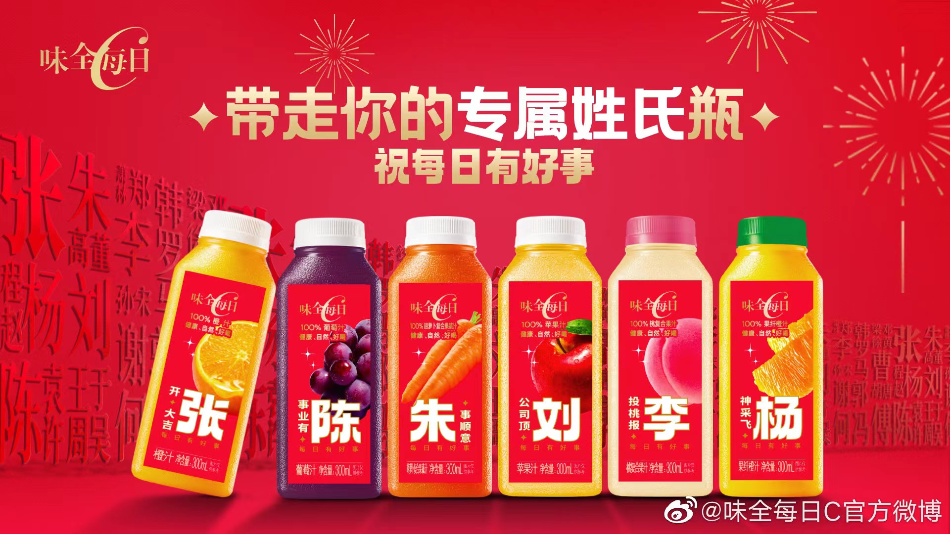 味全每日C推出了百家姓氏瓶,以传统姓氏为创意元素设计新年限定包装。该系列包含张、陈、朱、刘、李、杨六个姓氏,每个姓氏也都有各自专属的谐音梗祝福语,如“开‘张’大吉”、“‘朱’事顺意”等,在给顾客们送上温暖祝福的同时让百家姓文化更富有趣味。