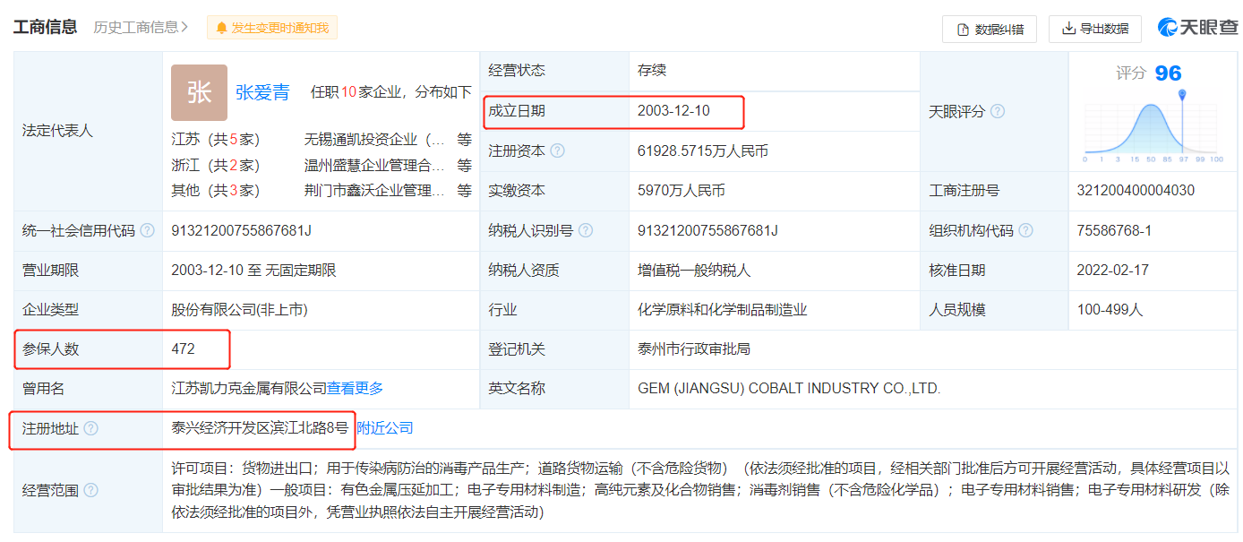 格林美江苏钴业成立于2003年12月,参保人员有472人,注册地在江苏省泰兴经济开发区滨江北路8号,主营业务为锂离子电池正极材料制造,主要生产销售钴产品。