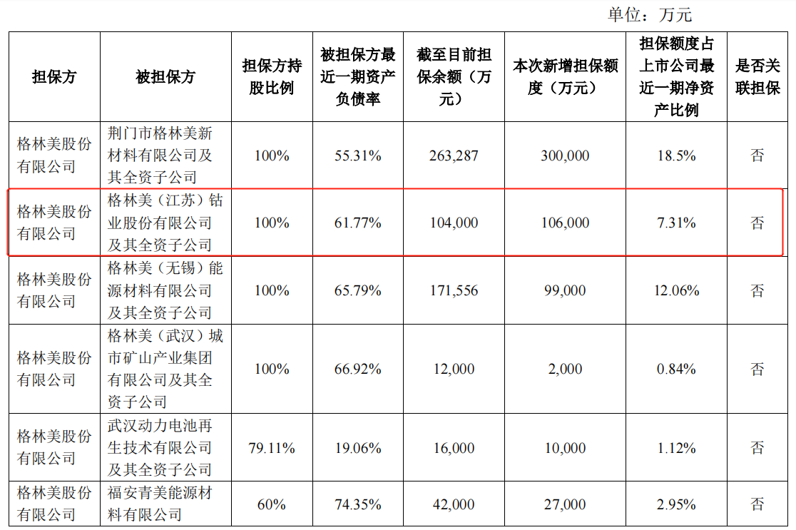 2022年8月,格林美及控股子公司累计对外担保总额为213.15亿元,占2021年12月31日经审计净资产的比例为 149.80%,其中对格林美江苏钴业的担保额度为21亿元,占公司净资产的比重为7.3%。