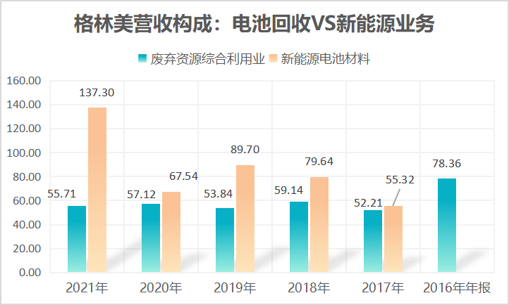 在正极材料上的踏马疾驰,也使得格林美营收构成发生巨大变化。2016年以前公司未开展新能源业务,2017年该项业务营收从55.32亿元增至2021年末的137亿元。而在锂电回收越发成为风口的趋势下,作为原来的明星业务,电池回收利用板块营收一直未见增长,反而有下降趋势。2016年该业务营收超78亿元,到了2022年三季末该数字降至55.7亿元。
