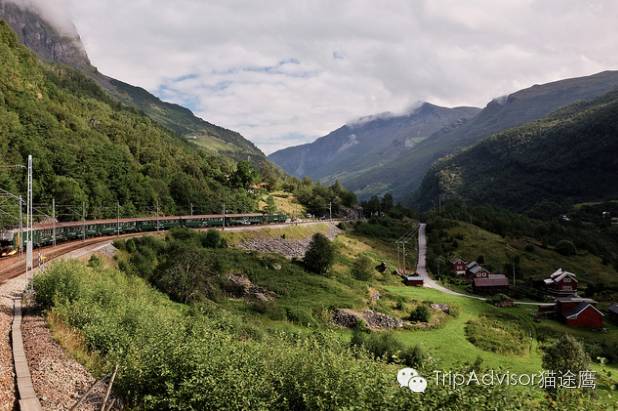 佛莱姆铁路是欧洲最陡峭的铁路,火车的两端落差有八百多米。坐在车上你可以感受到火车在一步一步的向上攀登,车窗外是常年被冰雪覆盖的山峰和从山间倾泻而下的瀑布,即使在夏天这里的山峰也覆着一层薄薄的雪。