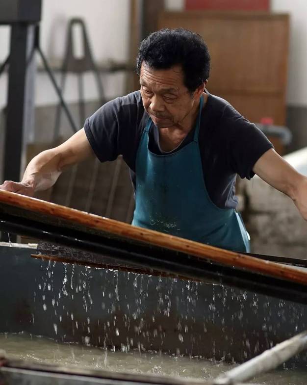周师傅所负责的抄纸,是影响纸张质量的关键所在。凭着多年的经验和技巧,手和眼的细致把控,精确的控制抄纸的时间和厚度。他的双手终日浸泡在浆水中,虽然双手已经发白变形,但是他的脸上总是带着自豪的笑容,他说:“我们做的这个纸,这个原料,搁一百年都不会烂掉。”
