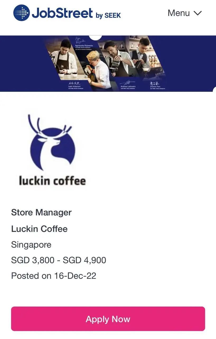 瑞幸咖啡近日在招聘网站JobStreet上发布了招聘帖子,招聘新加坡门店经理,薪资为3800新元-4900新元(约合19000元人民币-25000元人民币)。同时,瑞幸咖啡还将招聘市场经理、项目经理、高级工程师等职位,这些岗位的应聘要求略高,薪资尚未披露。