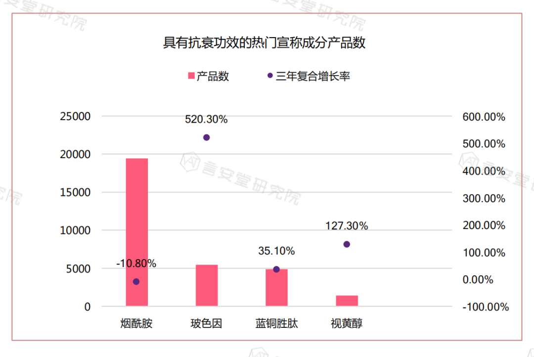 一方面,抗衰几乎涵盖了所有热门功效宣称,包括抗氧化、清除自由基、抗糖化、充盈祛皱、舒缓修复、乃至美白淡斑等,均与抗衰产品有着关联。
