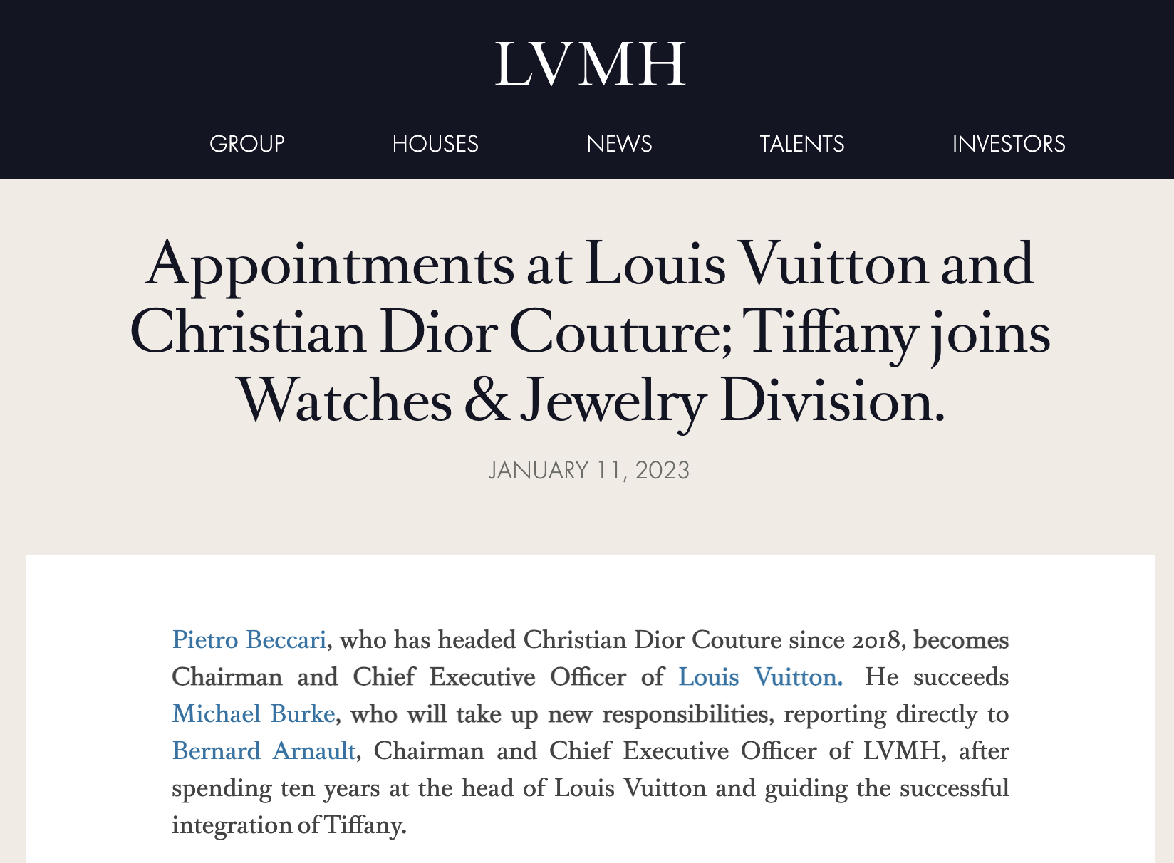 1月11日,奢侈品巨头路威酩轩集团(LVMH )官网宣布,迪奥(Dior)首席执行官Pietro Beccari将接替Michael Burke,成为路易威登董事长兼首席执行官,后者将“承担新的职责”,直接向LVMH董事长兼首席执行官Bernard Arnault汇报。