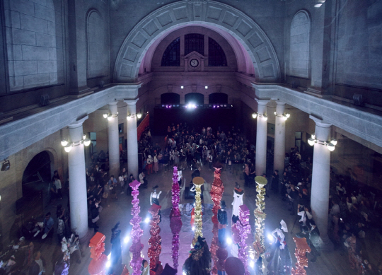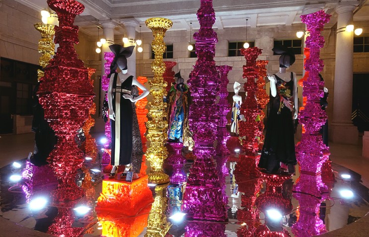 展览正厅是一组名为“Korean Fantasy”的系列作品,14件来自韩国不同年代下的顶级设计师的礼服主要用于快速呈现韩国传统服饰到现代服饰之间的变迁和潜在关系。并结合当代艺术家Choi Jung-hwa设计的五彩古希腊石柱装置艺术作品。Choi Jung-hwa也是该展览的艺术总监。这场展览也包含了韩国设计师与当代艺术家之间的合作,不同主题的房间里都有邀请一位艺术家来打造符合主题的装置艺术作品。