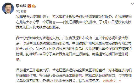 香港特别行政区行政长官李家超1月11日在微博发文表示,“目前通关工作进度良好,香港已逐步迈向完全回复正常的生活,对本港经济有积极提振的作用,将为各行各业带来正面的影响。我和团队会继续努力,与内地相关单位紧密联系,务求尽快达至全面通关,振兴本港经济。”