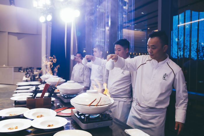 此外,彩丰楼还打造了符合中华美食文化的待客之道。中国茶文化中经典仪式“凤凰三点头”,是餐厅茶礼的一部分。粤菜中的“彩头”多使用鸡肉呈现,为此,彩丰楼推出黑松露瓦罐鸡寓意“彩凤送吉祥·四季享安康”的专属上菜礼仪。