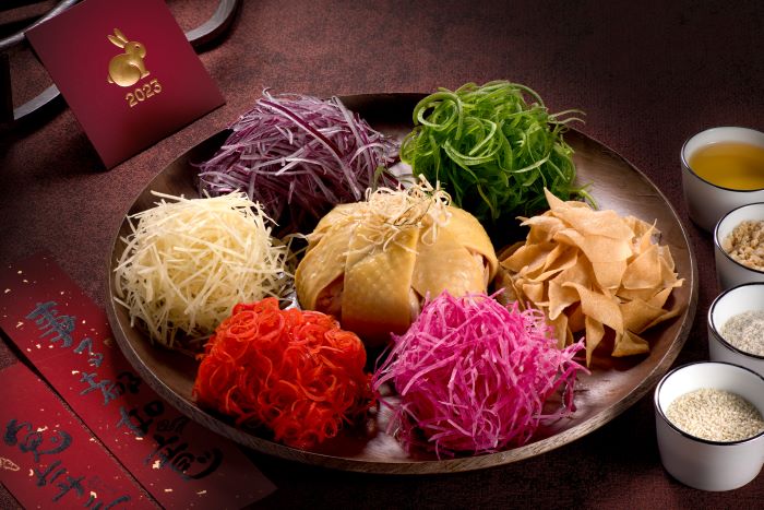 【风生水起 彩丰捞鸡】是广东顺德的特色菜,使用整只清远鸡焗熟后切分,搭配色彩缤纷的各式小菜,现吃现拌,享用时通过“捞”的动作,意味着收获一年的好运。