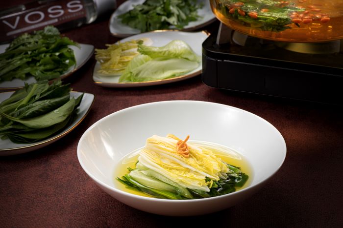 【六六大顺 泉水灼时蔬】优选六款时蔬并采用黑珍珠餐厅指南官方推荐用水VOSS灼制而成,翠绿嫩黄的色彩犹如春回大地,简单的烹饪方式更彰显食材的品质。