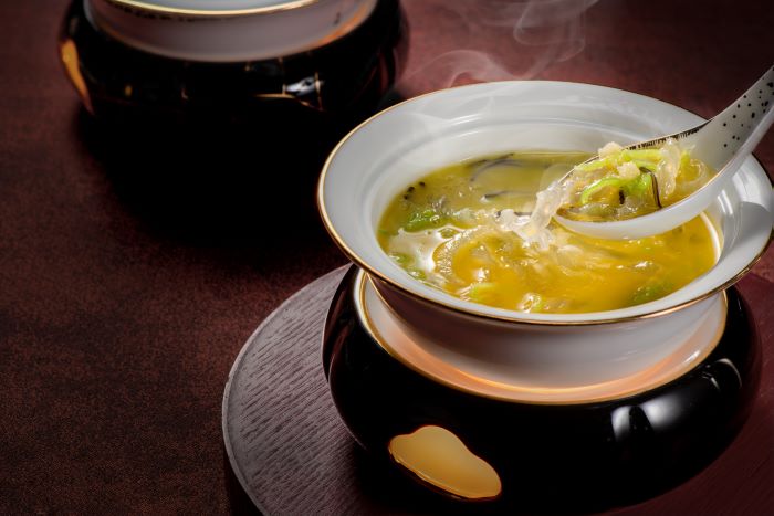 【龙马精神 酸辣龙筋羹】以鲟龙鱼筋蒸至酥烂,加上精心熬煮的黄焖浓汤,搭配熟番茄蓉和黄灯笼辣酱,这一暖心又醒味的汤品,象征着蓬勃的生机与自强不息的向上精神。