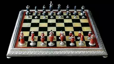 这幅国际象棋由俄国著名珠宝首饰工匠彼得·卡尔·法贝热于1905年为沙皇尼古拉斯二世所制。不过法贝热和尼古拉斯二世都跟我们今天要讲是故事没有什么联系。