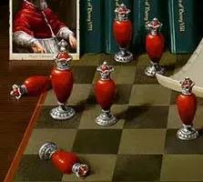 大家请注意这幅绘画作品左下角的一组红色的国际象棋。