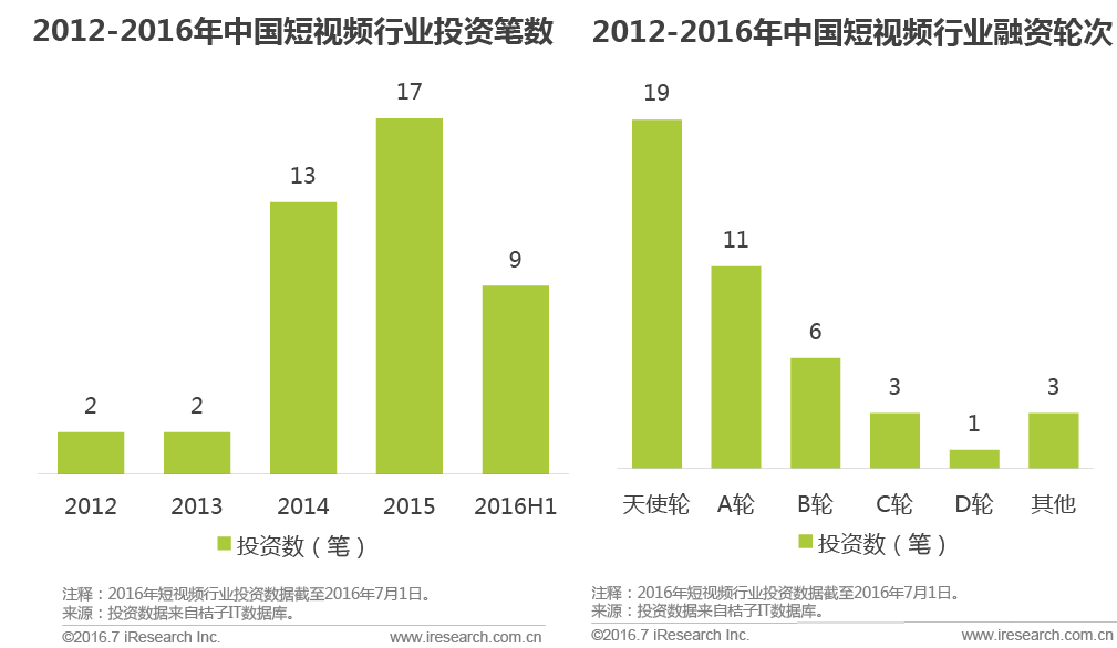 艾瑞统计数据显示,截止2016年7月1日,短视频行业共获得43笔投资。 2014年之前短视频行业获投资较少,2014、2015年短视频行业投融资持续火热;2016年截至7月已有9笔投资,更有超越2015年之态势。从投资轮数来看,绝大部分投资为种子天使轮和A轮投资,这两类投资总计30笔,占比高达69.8%。