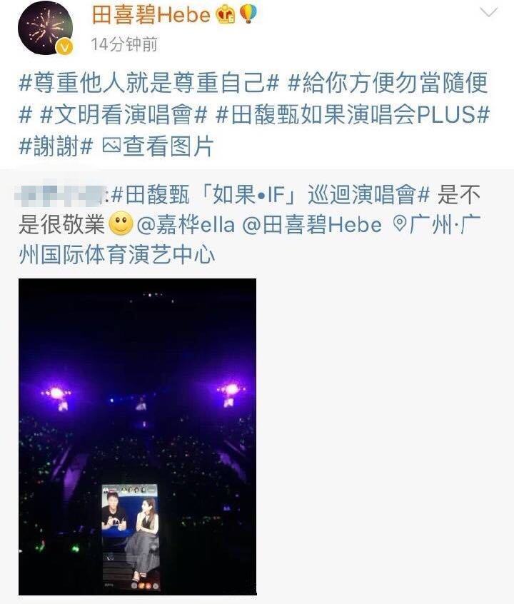 9月24日,S.H.E成员田馥甄“如果IF”个人世界巡回演唱会PLUS在广州举行。演唱会期间,有歌迷发微博表示正在演唱会上用手机看S.H.E另一位成员ELLA的直播,这一举动惹怒了Hebe,演唱会结束后Hebe转发了该歌迷的微博,怒斥其不尊重演唱会全体工作人员的行为,并表示如果不检讨改进就别来演唱会了。