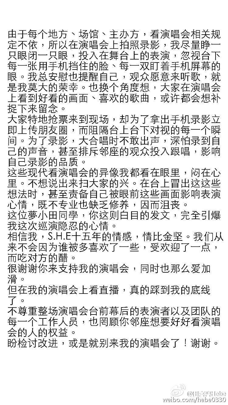 田馥甄在微博上写道:“每次在演唱会上看见歌迷拍照录影都尽量睁一只眼闭一只眼,也能理解大家希望把美好画面捕捉下来的想法。我也尽量提醒自己要更加专业,闷在心里不想说出来扫大家的心。但你这则白目的发文完全引爆了我这次巡演隐忍的心情,在演唱会上看直播真的踩到了我的底线。”