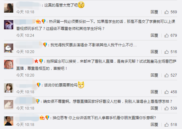 在现实中,每一场演唱会、音乐节都会有粉丝用手机录像拍照,我们也已经习以为常了。国内版权意识薄弱,也没有相关法律明文规定禁止,也是造成如今这种现象泛滥的原因之一。