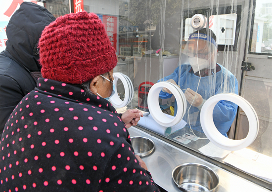 安徽省淮南市寿县堰口镇中心卫生院为老人进行抗原检测。陈彬/摄