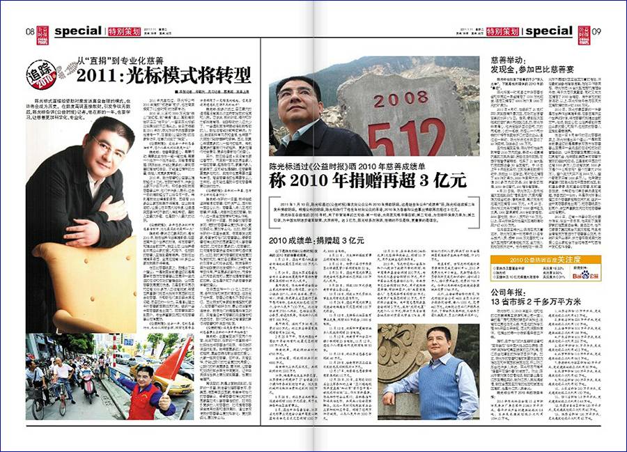 ▲ 2011年1月11日,《公益时报》两版刊发陈光标慈善事迹,并在文中标注“以下是陈光标给《公益时报》发来的2010年的慈善成绩单。”