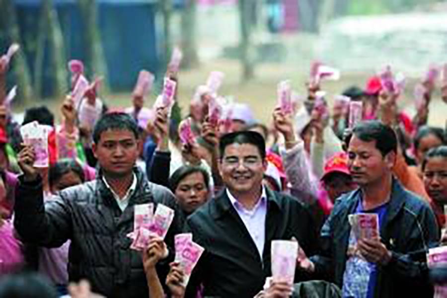 ▲ 2011年3月,陈光标在云南盈江地震灾区发放现金并拍照。 南方都市报