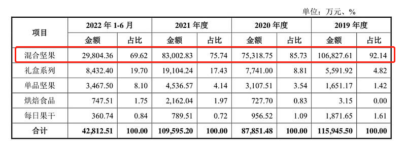 此次招股书显示,2019年到2022年上半年,混合坚果类产品收入分别占公司主营业务收入的92.14%、85.73%、75.74%、69.62%,虽然呈逐年下降趋势,但该类产品收入占比仍然过半,存在产品结构单一的风险。