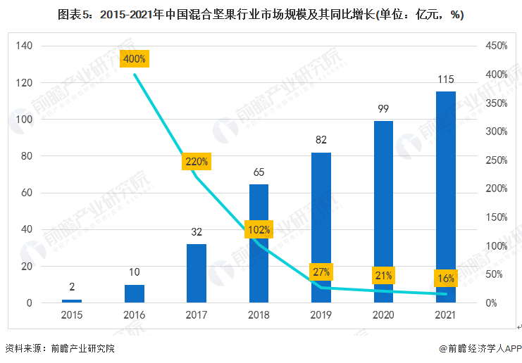 外部竞争对手也在蚕食混合坚果市场。洽洽食品、三只松鼠、良品铺子、来伊份、百草味等纷纷推出自家的每日坚果产品。而据前瞻产业研究院数据,中国混合坚果行业市场规模增速自2016年的400%逐渐降至2021年的16%,行业整体规模增速放缓,这对于仅凭坚果扛起营收的沃隆来说,风险或将更高。