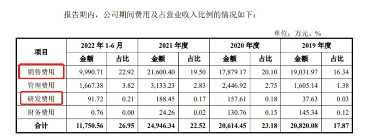 招股书显示,2019年-2022年上半年,沃隆食品研发费用分别为37.63万元、157.61万元、188.45万元和91.72万元,占营业收入的比重分别仅为0.03%、0.18%、0.17%和0.21%。