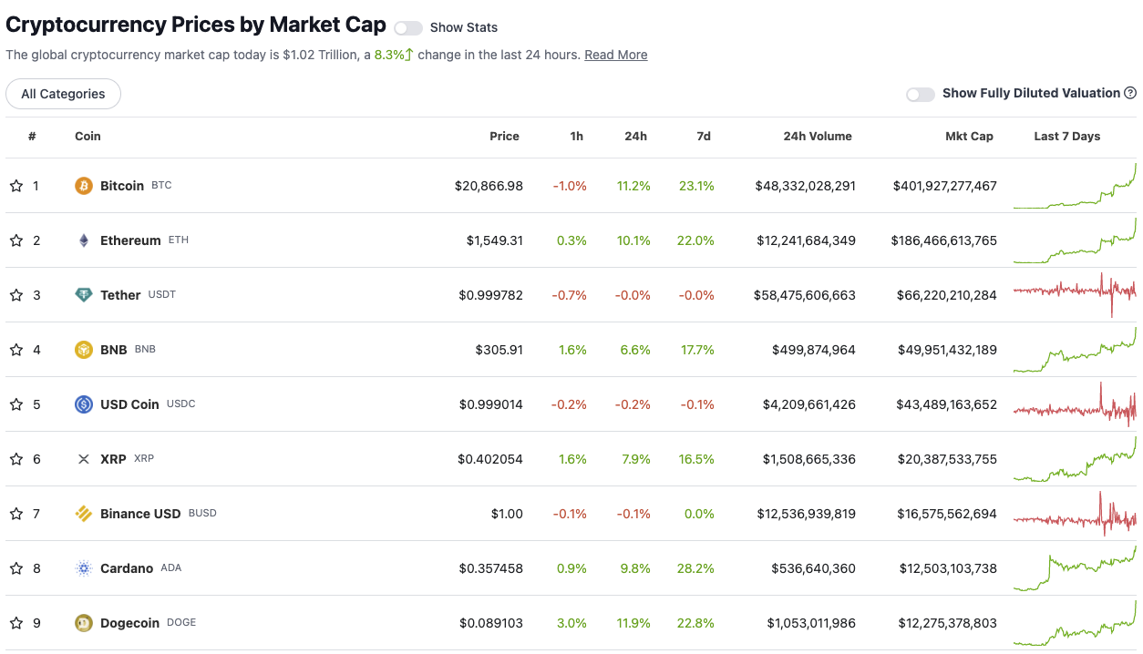 加密货币行情网站CoinGecko数据显示,受比特币价格反弹影响,当前加密货币总市值重回1万亿美元上方,达到1.02万亿美元。其中,比特币24小时内上涨11.2%,现报20866美元/枚。
