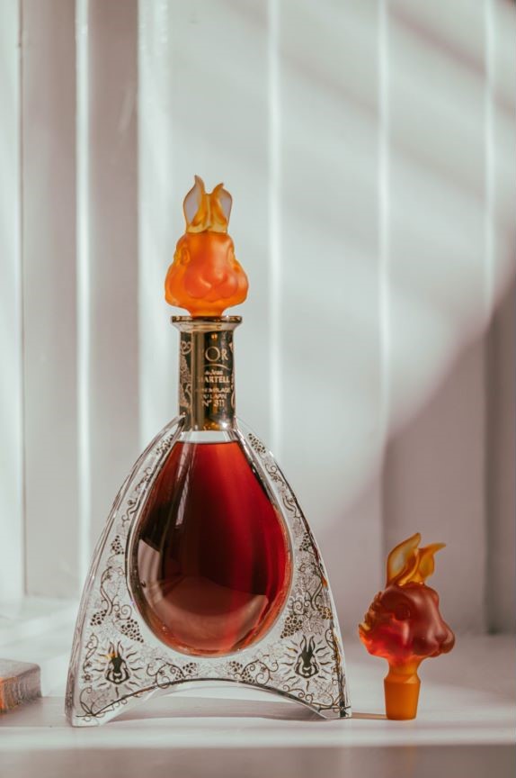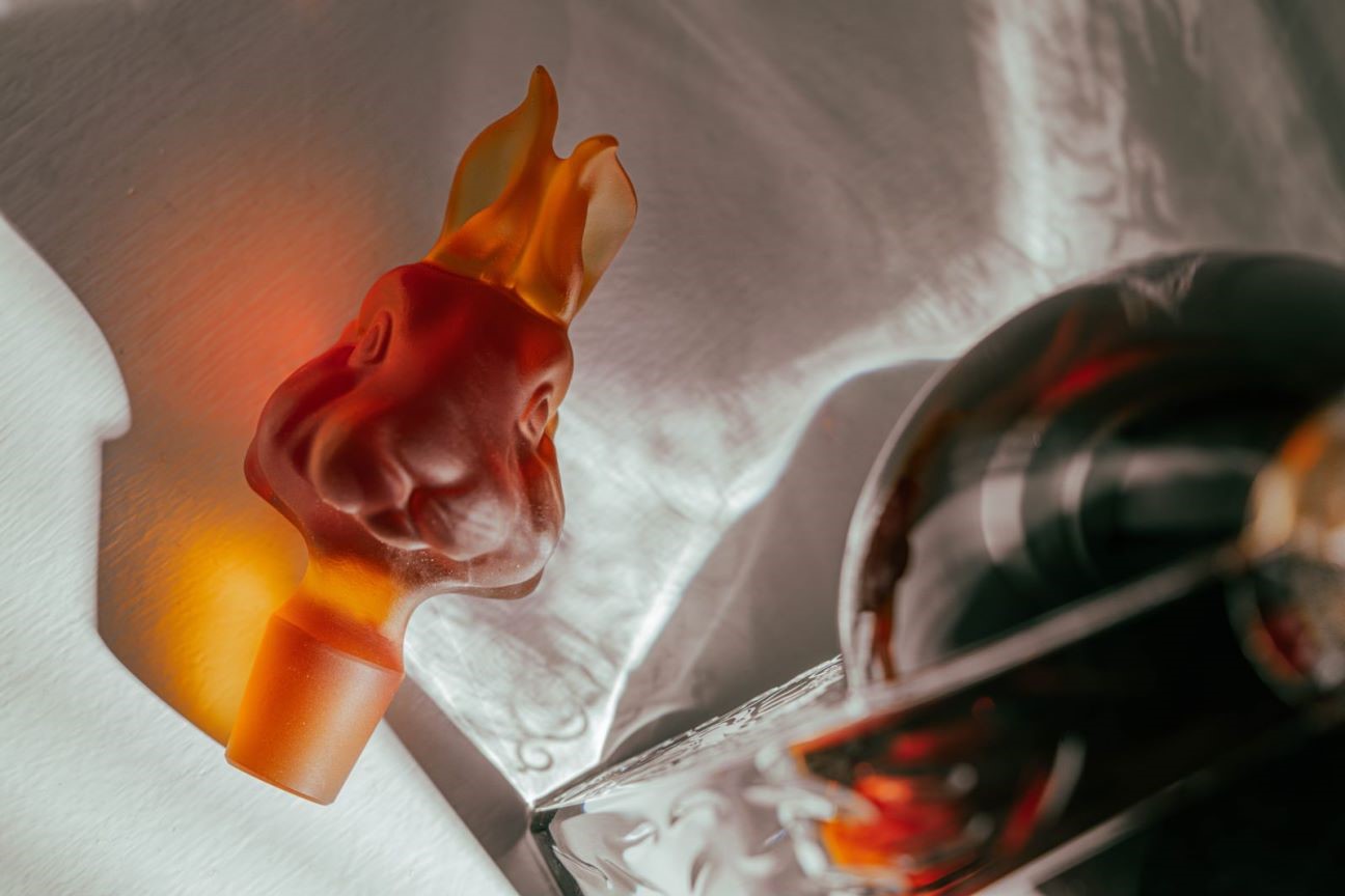 尚·马爹利干邑琉光兔年限量版以镀金水晶酒樽盛装,并特邀法国水晶工艺世家Manufacture Daum独家定制了一款兔头水晶瓶塞,并附有相对应的编号,来自法国的水晶制作工坊Sèvres则制作了瓶身。