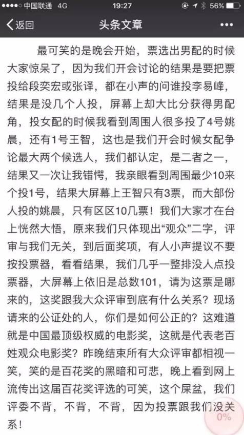 百花奖评奖结果出来之后,微博上名为“先锋团支部”的网友发出一篇名为《直击百花奖黑幕》的长文章,声称自己是这届百花奖参与投票的101位大众评审中的一名,他详细介绍了投票过程,让人们看到这样不合情理的结果是如何产生的。