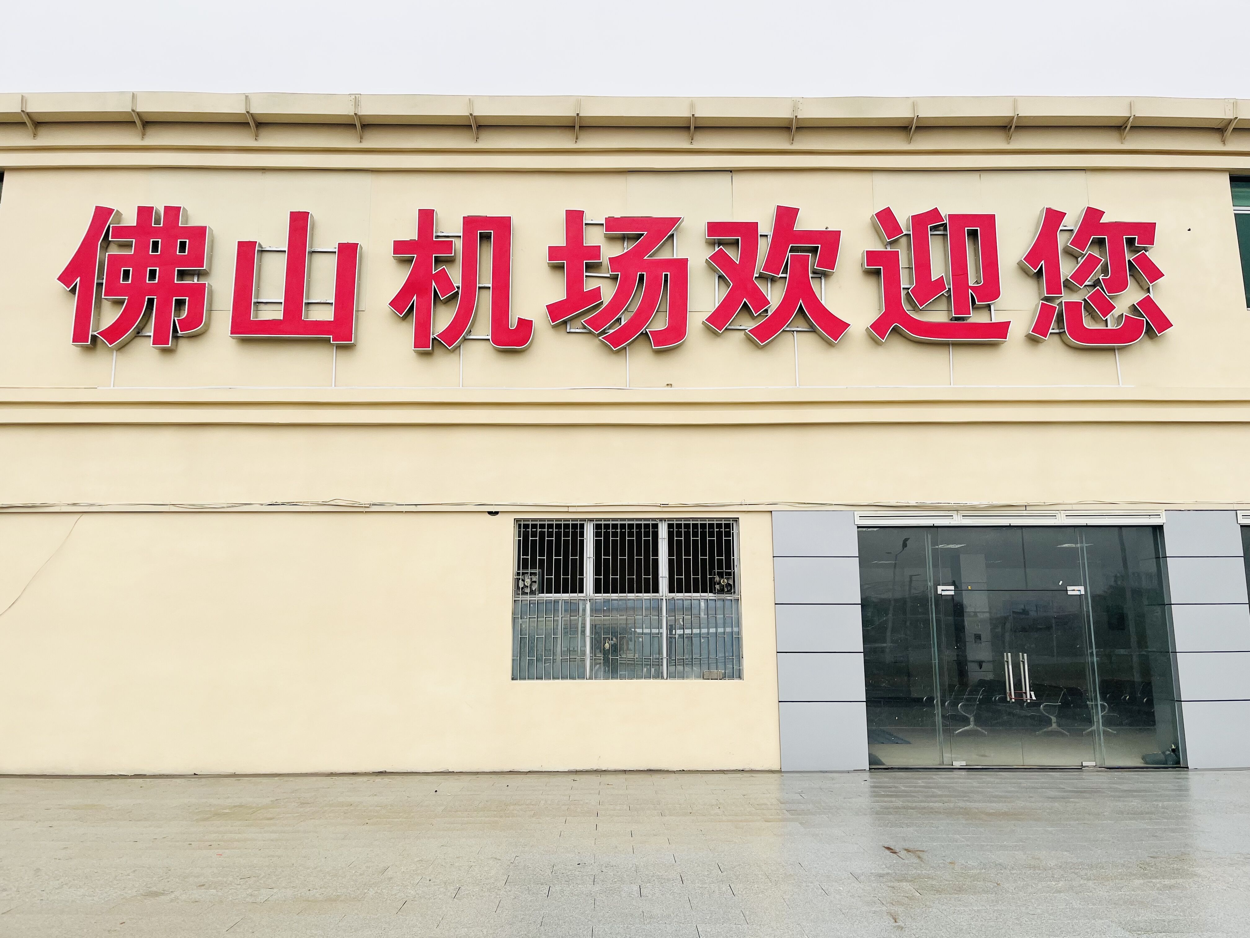 佛山机场候机楼门前紧挨着农田,楼面上出发厅三个红色字牌据说前几年让台风刮跑了,大厅里还用壁挂式电扇,旅客通道入口和出口是同一个门,难怪有网友戏称这里得叫“候机大棚”。