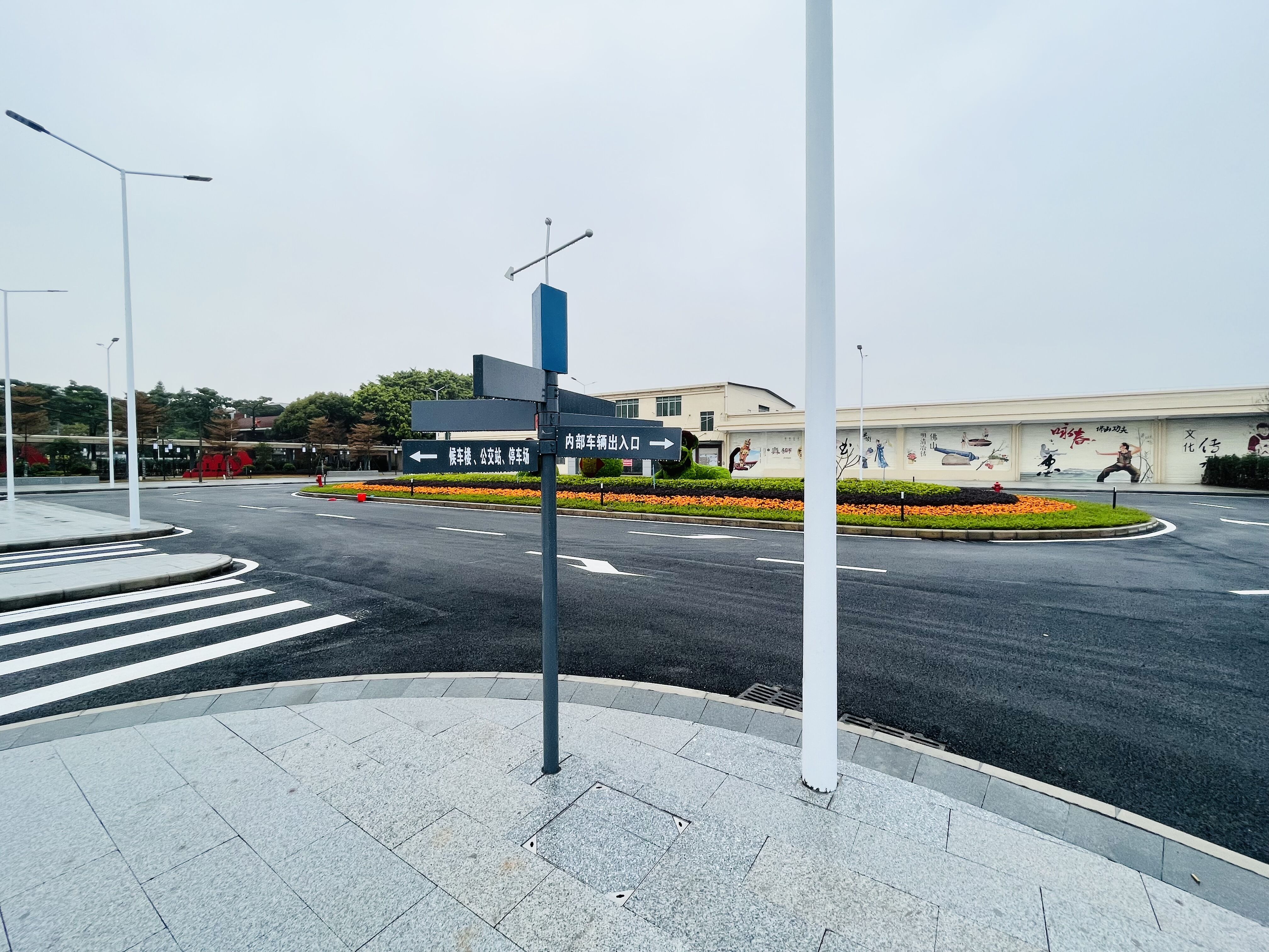 前广场的主体建筑重新粉刷,用简洁柔和的色调带给人们温暖感觉,并植入了佛山传统文化元素,舞狮、戏曲、功夫、龙舟、剪纸等艺术插画惟妙惟肖,加强人与佛山的情感联系。