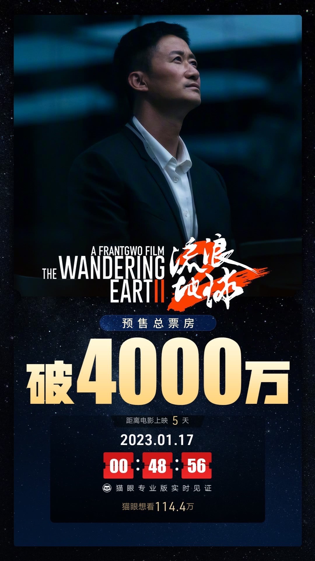 据猫眼专业版数据显示,电影《流浪地球2》映前5天 ,预售总票房破4000万。