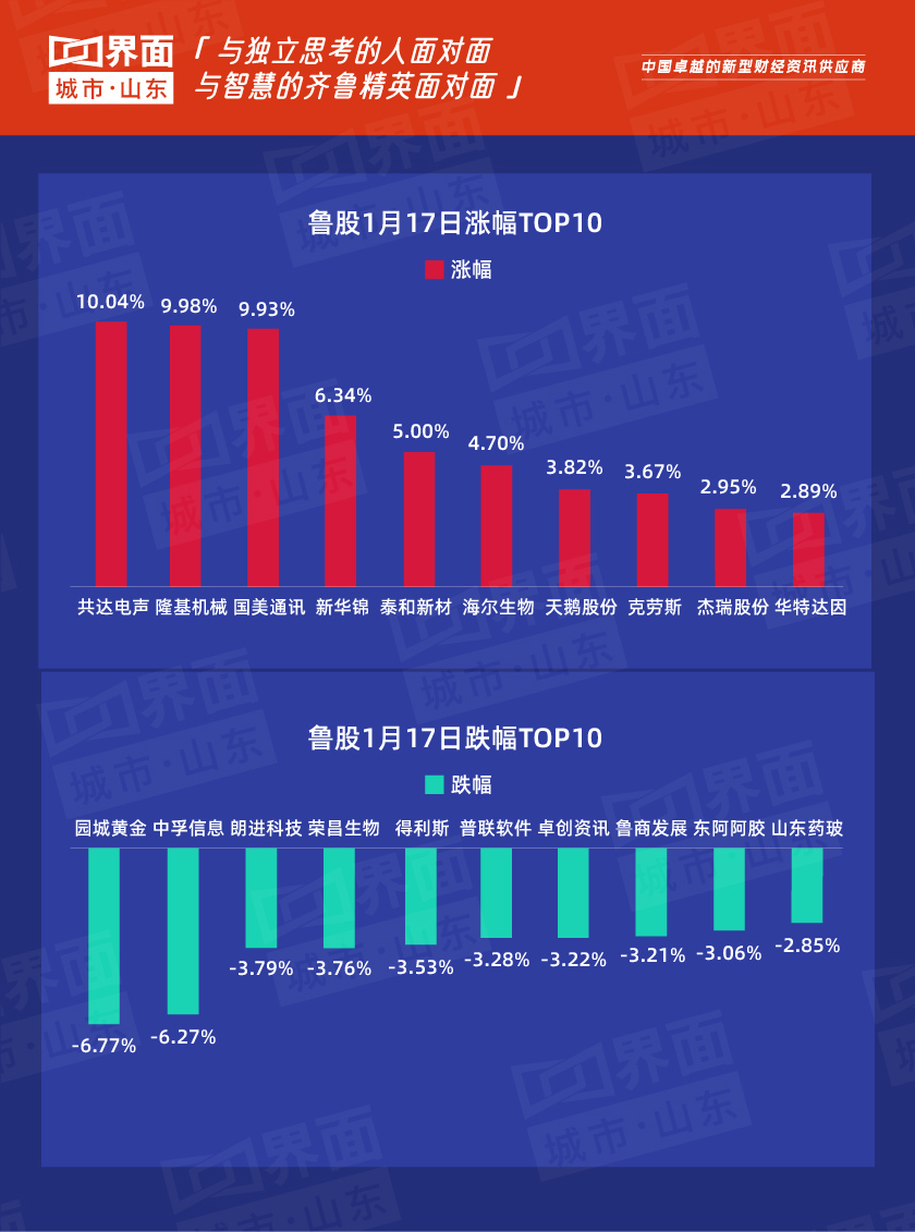 1月17日,山东省内沪深京股票有102只个股上涨,13股持平,174只下跌。