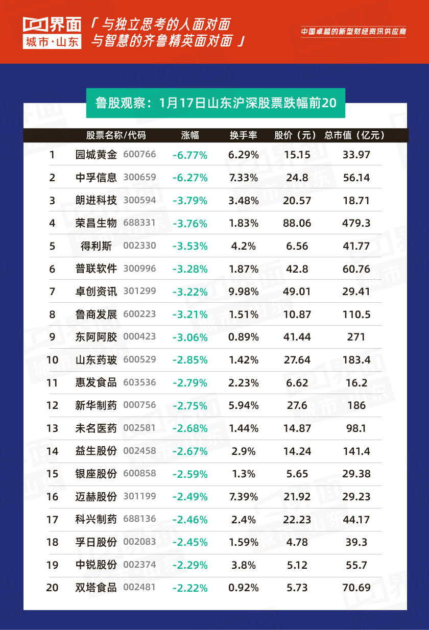 烟台市跌幅榜首:园城黄金(600766),跌幅6.77%,股价15.15元,总市值33.97亿元。