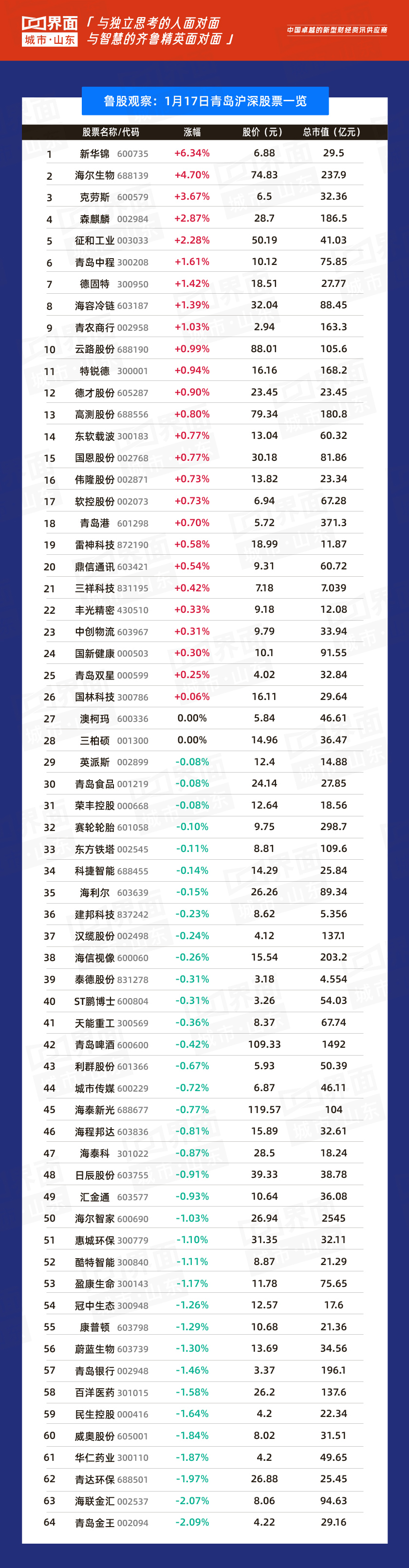 青岛市涨幅榜首:新华锦(600735),涨幅6.34%,股价6.88元,总市值29.5亿元;