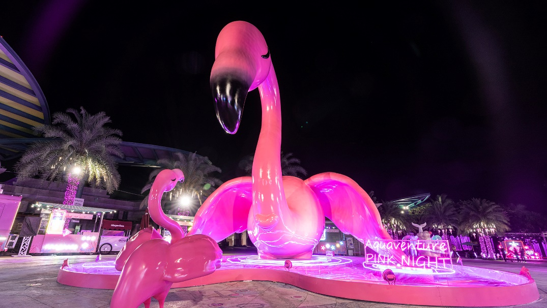 “亚特兰蒂斯水世界粉色之夜”以粉色为主旋律,多维度地展现整个度假区的独特魅力。活动期间,水世界每日营业时间延长至21点,内部所有滑道将于当日18点全部关闭。亚特兰蒂斯为这次特色活动倾情打造了3座巨型粉色雕塑:6米高的火烈鸟《走近》、5米高的海狮《分享》以及4米高的白鲸宝宝《触碰》。另外还有其他装置艺术值得探索一番,比如,盘踞水世界入口的火烈鸟示意着欢迎宾客《下潜》至粉色世界;宾客亦可穿梭于粉色拱门,跟随霓虹灯的变幻《邂逅》身边的惊喜。海马、水母、白鲸造型等粉色灯饰“畅游”在夜晚的水世界,整片路面的粉色氛围灯光设计宛若粼粼波光,将宾客置身于浪漫梦幻的“粉色海洋世界”,让人驻足流连。