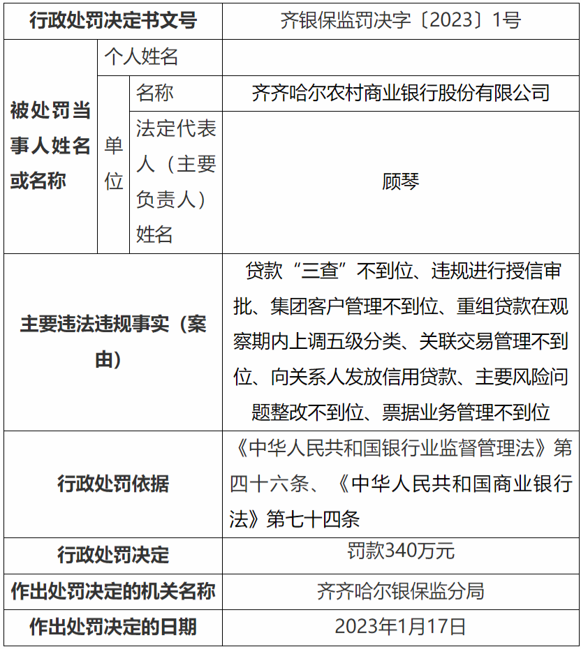 1月19日,齐齐哈尔银保监分局披露的行政处罚信息公开表显示,2023年1月17日,齐齐哈尔银保监分局对齐齐哈尔农村商业银行股份有限公司予以罚款340万元的行政处罚。主要违法违规事实包括贷款“三查”不到位、违规进行授信审批、集团客户管理不到位、重组贷款在观察期内上调五级分类、关联交易管理不到位、向关系人发放信用贷款、主要风险问题整改不到位、票据业务管理不到位。