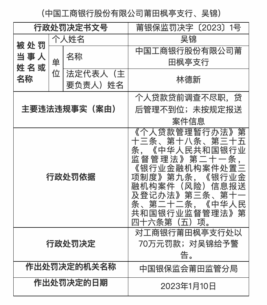 1月19日,莆田银保监分局披露的行政处罚信息公开表显示,2023年1月10日,莆田银保监分局对工商银行莆田枫亭支行处以70万元罚款;对吴锦给予警告。主要违法违规事实为:个人贷款贷前调查不尽职,贷后管理不到位;未按规定报送案件信息。
